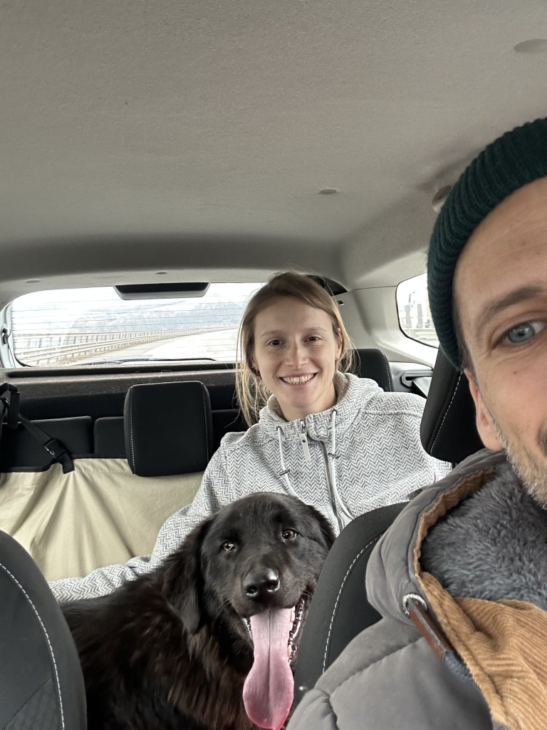 Drumul spre casă a fost mai greu la început deoarece nu a prea vrut să intre în mașină alături de doi “străini”. Cel mai cool a fost să o vedem cum se relaxează în brațele lui Geo și mai ales că nu a vomat (noi fiind pregătiți pentru așa ceva). Am făcut un mic popas la Alba Iulia, să se poată dezmorți puțin. A doua parte a drumului a mers perfect, s-a relaxat aproape imediat și a rămas așa până am ajuns acasă. Primele semne că este un câine capabil să se acomodeze repede.